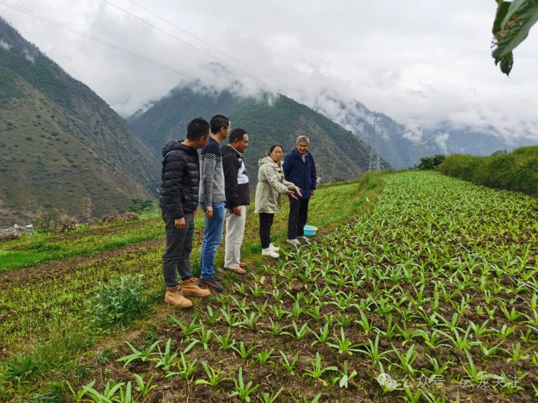 駐村工作隊與村民探討貢菜種植。陶華 攝