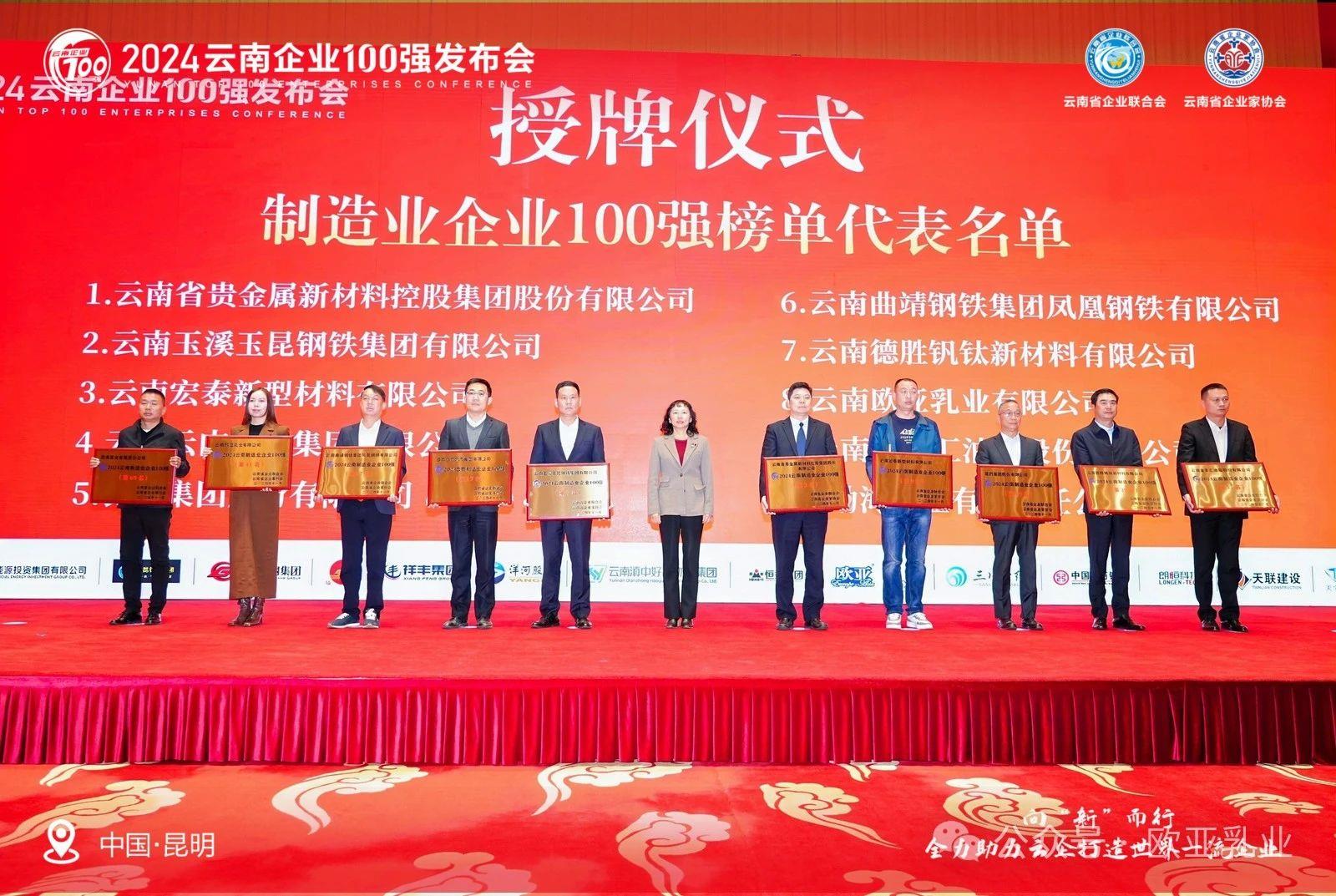 11月22日下午,由云南省企業(yè)聯(lián)合會、云南省企業(yè)家協(xié)會主辦的“2024云南企業(yè)100強(qiáng)發(fā)布會”在昆明海埂會堂隆重舉行,大理州企業(yè)家協(xié)會理事單位——云南歐亞乳業(yè)有限公司被授予“云南企業(yè)100強(qiáng)”“云南制造業(yè)企業(yè)100強(qiáng)”雙百強(qiáng)榮譽(yù),公司常務(wù)副總馬紫怡出席會議并代表公司領(lǐng)取獎項(xiàng)。