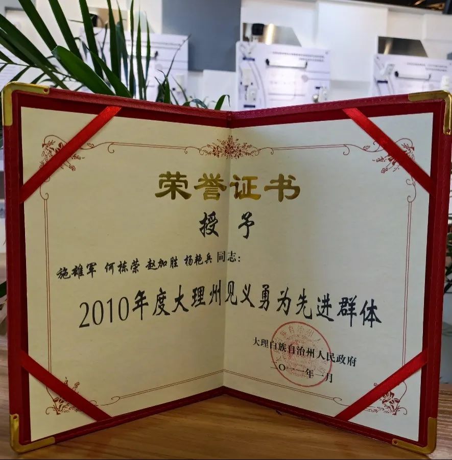 2010年2月15日,施雄軍和同事在龍山巡邏過程中,突然發(fā)現(xiàn)龍山公園著火,他和同事立即向起火點(diǎn)趕去,到達(dá)現(xiàn)場后第一時(shí)間撥打“119”和“110”報(bào)警電話,并立即組織隊(duì)員四人進(jìn)行撲救,因?yàn)榍捌谔幹玫卯?dāng)火情沒有進(jìn)一步蔓延。待消防救援人員到達(dá)后,施雄軍和同事幫助維護(hù)現(xiàn)場交通和秩序,直至大火被完全撲滅。事后,施雄軍和他的同事們被評為“2010年度大理州見義勇為先進(jìn)群體”。