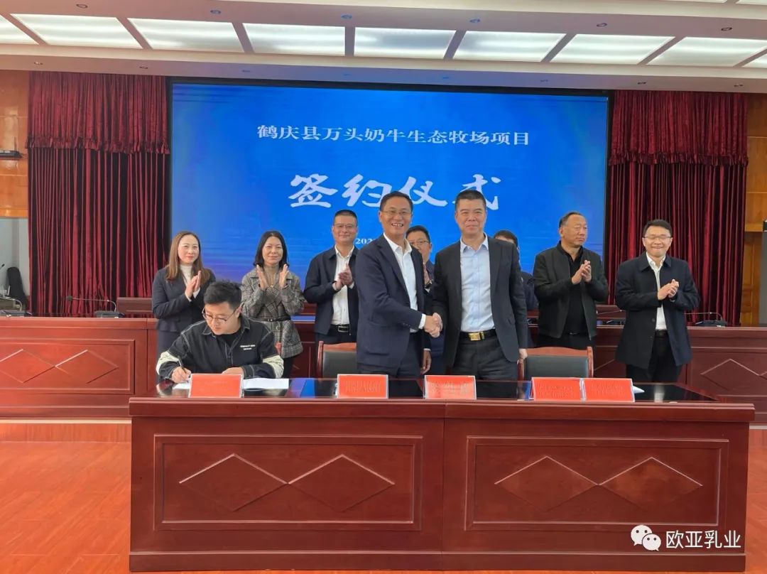 為加快綠色奶源基地建設(shè),提高優(yōu)質(zhì)原料奶供應(yīng)量,大理州企業(yè)家協(xié)會(huì)理事單位——云南歐亞乳業(yè)有限公司繼2015年在鶴慶縣金墩鄉(xiāng)北溪村投資建設(shè)萬(wàn)頭國(guó)家級(jí)奶牛標(biāo)準(zhǔn)化示范場(chǎng)后,11月8日,又與鶴慶縣政府簽定投資協(xié)議,新建一個(gè)存欄11000頭娟姍奶牛的有機(jī)生態(tài)牧場(chǎng)。大理州政府黨組成員、一級(jí)巡視員吉向陽(yáng),鶴慶縣四班子領(lǐng)導(dǎo),縣級(jí)相關(guān)部門負(fù)責(zé)人等領(lǐng)導(dǎo)出席儀式,歐亞乳業(yè)公司董事長(zhǎng)彭金國(guó)及管理人員參加儀式。